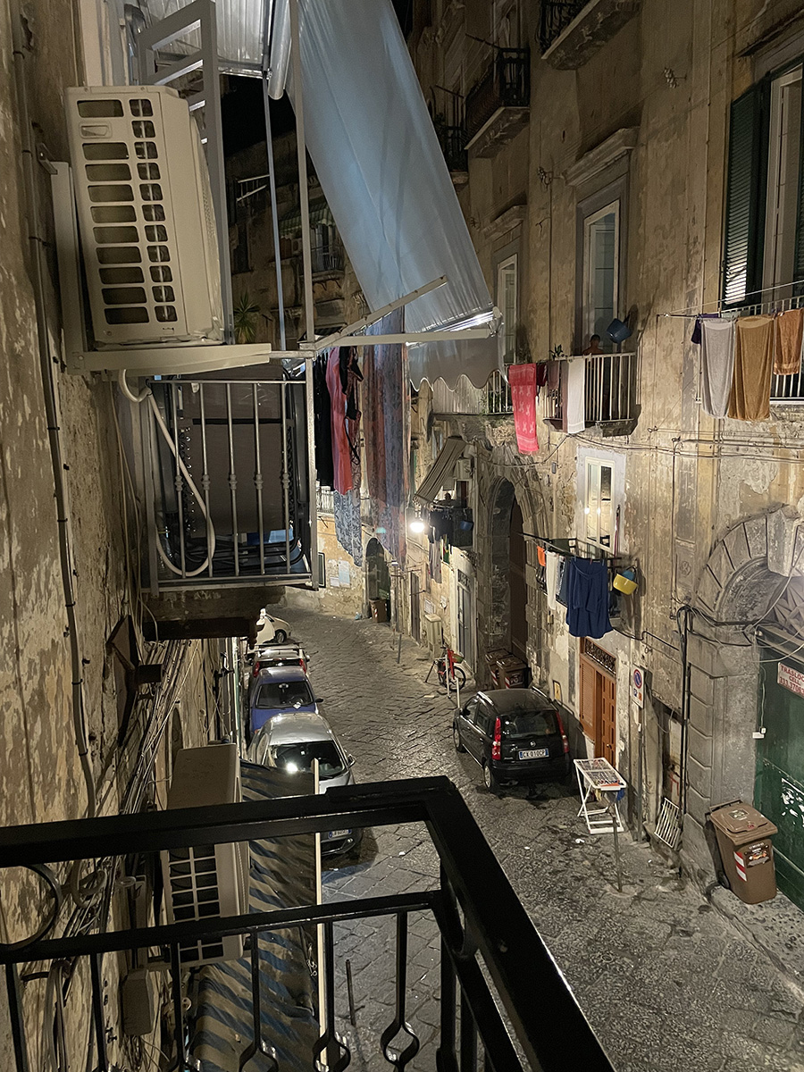 Hogerop in deze wijk wonen veel Napolitanen. De was hangt buiten, buren babbelen met elkaar buiten en roepen van de ene kant van de straat naar de andere.